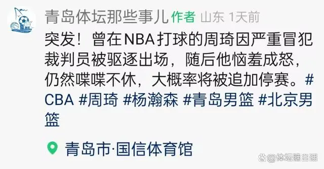 根据青岛媒体报道,周琦大概率会被追加禁赛,因为CBA公司刚强调了赛风赛纪,周琦可以说是顶风上。