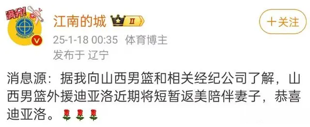 根据媒体人报道,由于家庭原因,迪亚洛会在近期离开山西男篮,回国一段时间,大概会缺席3场比赛左右,这或许是山西男篮之前补充了戈德温的原因。据了解迪亚洛顺利的话,会在窗口期的俱乐部中回到球队。